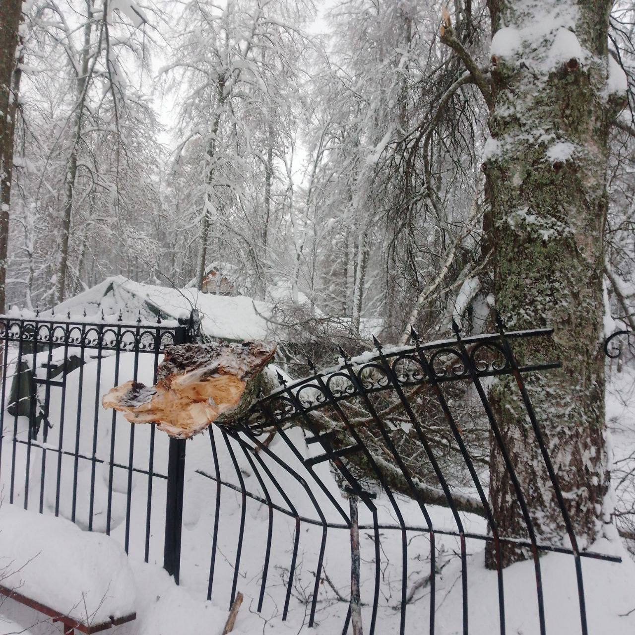 Несколько суток из-за снега с дождем, перемежающегося то оттепелью, то морозом деревья не выдерживали и либо падали полностью от корня, либо сыпались обламывающиеся макушки.